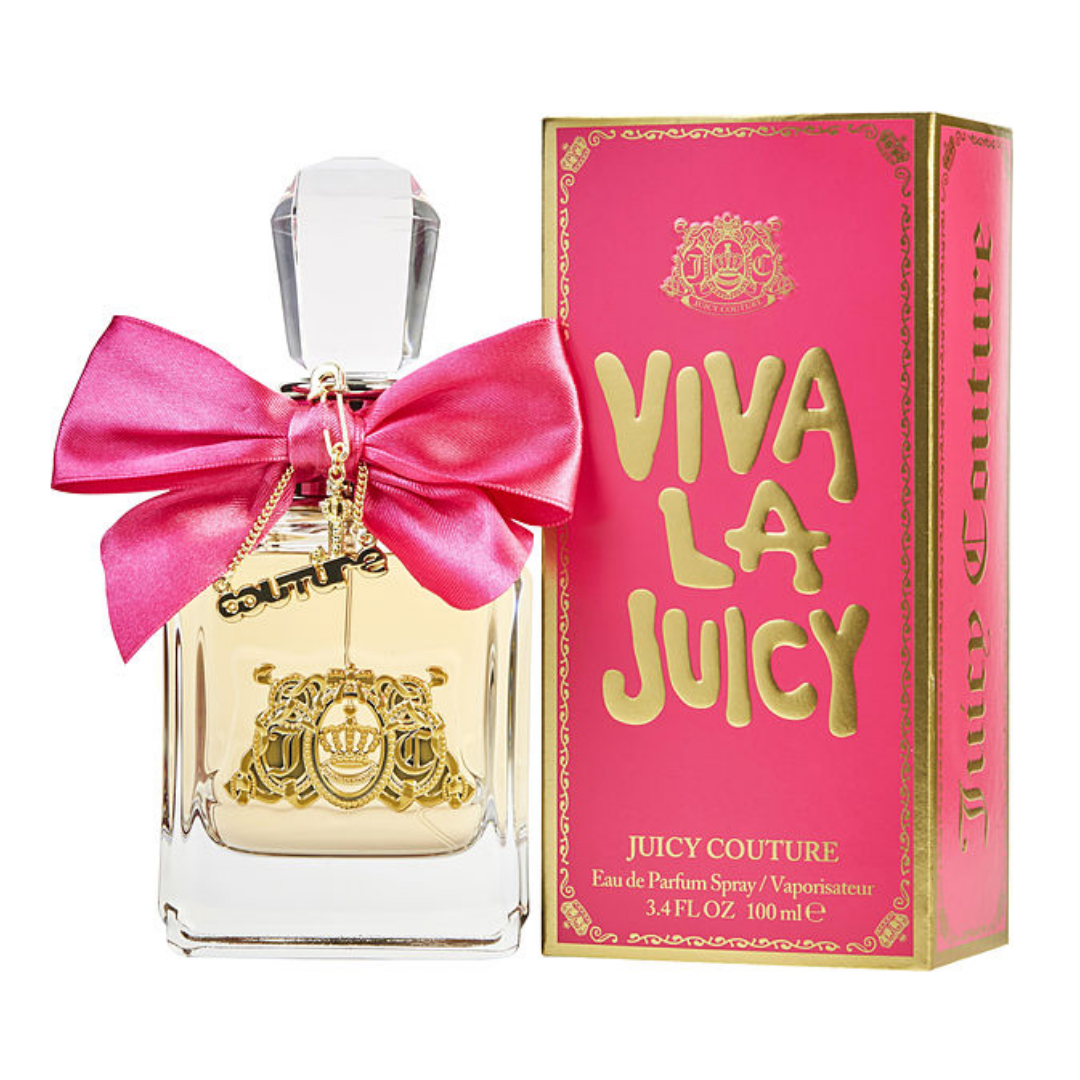 Viva La Juicy, an enticing scent of wild berries and mandarins, honeysuckle, gardenia, and jasmine. To round it out, amber, caramel, vanilla, sandalwood, and praline add just the right touch of sweetness. It's bottled in a bold gold decanter decorated with Juicy charms.